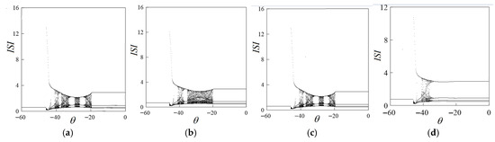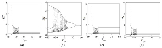 In the range of the synaptic threshold (−45, −20)’s discrete values −40, −35, −30, and −25, the bifurcation diagram of the synaptic reversible potential with respect to the interspike interval (ISI) is obtained as shown in Figure 4 shown. As the synaptic value gradually increases, the shape of the bifurcation diagram of the synaptic reversible potential changes. When = −35, the dynamic behavior of the periodic bifurcation diagram is richer, as shown in Figure 4b. The touch reversible potential is in the [−60, 60] region. As the value of the control parameter increases, the entire system completes the transformation from periodic cluster discharge→chaotic cluster discharge→chaotic peak discharge→periodic peak discharge. Therefore, when = −35, the discharge activity of the system changes more obviously, and the nonlinear dynamic phenomena are the most abundant.