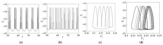 It is hypothesized that when , the chemical synaptic coupling is excitatory, and vice versa, inhibitory, where is the resting potential of a single neuron. As can be seen from Figure 3a, the neuron is in a resting state at V = −45, so the chemical synaptic coupling is excitatory when .