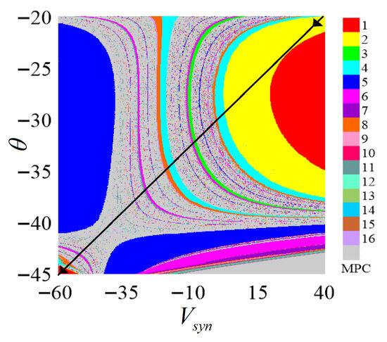 Based on the parameter matching results in Table 2, the numerical simulation shows the two-parameter ISI bifurcation of the synaptic reversible potential and the threshold value in Figure 7. It can be seen that along the black solid line arrow direction from the upper right corner to the lower left corner, the system transitions from period 1 to period 8 through period-doubling bifurcation, subsequently entering chaotic discharge; then, the system undergoes a very long chaotic burst phenomenon and then returns to the periodic discharge through reverse signal bifurcation near the lower left corner. The discharge process shows rich dynamic characteristics. The reason for this phenomenon can be attributed to the strong nonlinearity of chemical synapses.