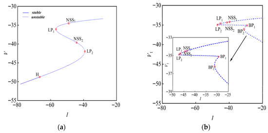 The distribution of the system’s equilibrium point is investigated, with the current serving as the bifurcation parameter. Figure 8 depicts the variation in the membrane potential at the system’s equilibrium point as this parameter changes. Specifically, when the strength of chemical coupling, Dsyn = 0, yielding the bifurcation map on the (I,V) plane as shown in Figure 8a. The bifurcation point data calculated based on the parameters in Table 1 and Table 2 are shown in Table 3; for the bifurcation point LP1, only one eigenroot exists, which is zero, while all other eigenroots are non-zero. Therefore, the bifurcation point LP1 is classified as a saddle-node bifurcation point, indicating that saddle-node bifurcation occurs at this point in the system. At the bifurcation point LP2, one of the characteristic roots is zero. Therefore, the bifurcation point LP2 is classified as a saddle-node bifurcation point. At the bifurcation point H, one pair of conjugate eigenvalues has a zero real part, and all eigenvalues are non-positive. Consequently, point H is classified as a Hopf bifurcation point. The first Lyapunov coefficient at point H is equal to 0.0961, which is greater than 0, and H is a subcritical Hopf bifurcation point.