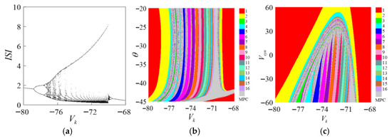 The reference parameters in the Chay neuron model represent the reversible potential of the ion channel. Figure 9a demonstrates the ISI of the single-parameter loop. From the bifurcation diagram, it can be seen that the system discharge is in the periodic plus period, and the whole process undergoes the process of doubling bifurcation → plus periodic bifurcation → inverse doubling bifurcation switching, and with the chaotic array phenomenon, it expands to two parameter changes. Figure 9b demonstrates . In the parameter plane, for the two-parameter bifurcation diagram when , , there is a short-term period between . During the mixing period, the system in the discharge state is chaotic, and then the inverse multiplication bifurcates back to period 1. Observing the entire area, when changes, the system discharge period changes greatly. Small changes can lead to large changes in the system discharge. However, if you observe the vertical axis alone, when , the change in causes a slight change in the discharge state of the system. When , it no longer affects the discharge of the system. It is shown in the figure that the shape of the vertical periodic window does not change. Thus, when the two parameters change at the same time, the change in the reference parameters plays a decisive role in the system, and the chemical synaptic parameters have only a small impact on the discharge status of the system. It can be seen in Figure 9c that when , with the change in synaptic reversible potential, the discharge period of the system directly enters a high-period chaotic region after completing the inverse doubling bifurcation, and there is no process of increasing the period. The process is single, and when the synaptic reversible potential is large, the system tends to be stable, and no bifurcation occurs again.