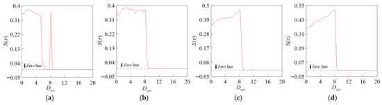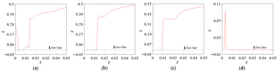 Statistic S versus time lag for different chemical coupling strengths. (a) = 6.0; (b) = 7.0; (c) = 8.0; (d) = 9.0.