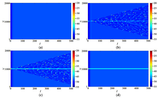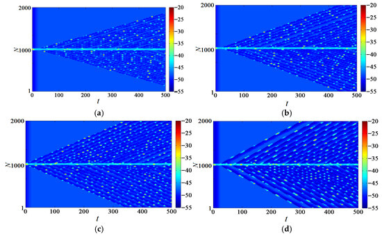 Changing the maximum conductance value of the leaky ion channel of the neurons located at 980–1020 and ensuring that the conductance values at other positions remain unchanged, as shown in Table 1, can evoke the neural network discharge to generate traveling waves, as shown in Figure 15a, allowing us to explore the influence of the chemical coupling strength on the electrical activity of the neuron, change the electrical coupling strength to = 0.1, 0.3, 0.5, 0.7, and observe the influence of the chemical coupling strength on network discharge.