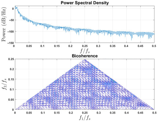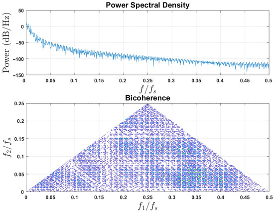 To analyze the employed chaotic system dynamical behavior, various state-of-the-art nonlinear analysis tools can be utilized, each serving a distinct purpose. Bicoherence is a powerful tool that measures quadratic phase coupling between different frequency components of a signal, helping to identify nonlinear interactions even in noisy data. This is particularly useful in distinguishing chaotic behavior from quasi-periodic phenomena. Power spectral density (PSD), on the other hand, analyzes the frequency content of a signal. In chaotic systems, PSD typically reveals a broadband spectrum, indicating a wide range of frequencies, which helps differentiate chaotic signals from noise and periodic signals. The PSD and bicoherence of system (1) with system parameters and are given in Figure 3 and Figure 4, respectively. These figures indicate the broadband nature and the nonlinearity strength of the suggested chaotic system.