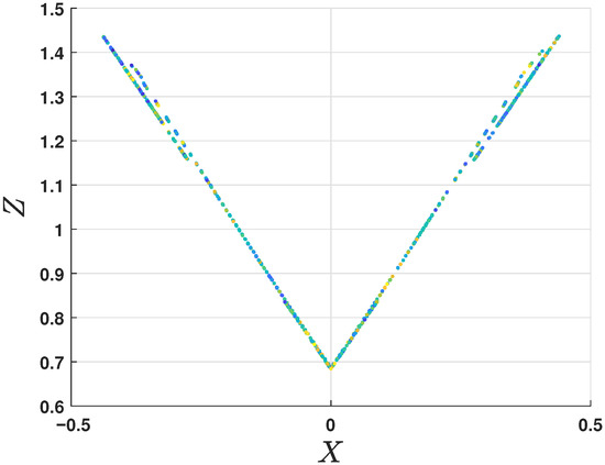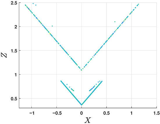 Poincaré maps for both the and cases, projected onto the plane, are depicted in Figure 5 and Figure 6, respectively. To analyze and verify the chaotic behavior of the system, for both cases, the intersections of the system trajectories with the plane provide a sequence of points that form the Poincaré map. In both contexts of and , the maps may reveal chaotic behavior where the points are organized in regular patterns, such as distinct clusters or closed curves.