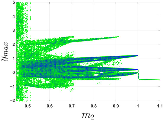 The bifurcation diagram of the system for control parameter , as depicted in Figure 7 and Figure 8, provides a clear visualization of the system’s dynamic behavior as parameter is increased. With the initial conditions set at for the initial iteration, and reinitializing to the last values of the state variables, the plots show how the system evolves under forward continuation. The plots reveal a complex dynamic, characterized by transitions between different states. Notably, there are regions where the plot exhibits a dense, seemingly random pattern, indicating the presence of chaotic behavior. Thus, the bifurcation plot not only confirms the existence of chaos but also highlights the intricate structure of the system’s phase space under varying parameter conditions.