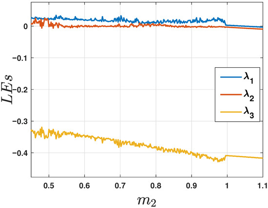 Lyapunov exponents (LEs) for the V/Heart shape system are derived using A. Wolfs’ method [21] for 10,000 s to check the chaotic state of the system for different system parameter values. Figure 9 shows the Lyapunov exponent (LE) spectrum for the system parameter in the range , and it is clear that for , the largest exponent remains positive, which is a conclusive indicator of chaotic dynamics within this parameter range. Positive Lyapunov exponents imply that small perturbations in the initial conditions grow exponentially over time, leading to sensitive dependence on initial conditions—a hallmark of chaos.