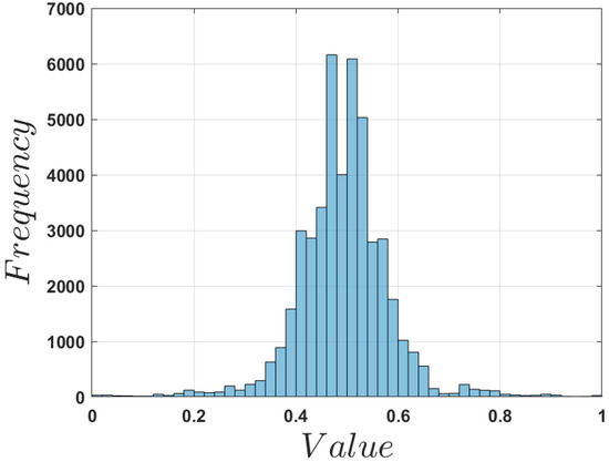Important measures indicate the usefulness of the proposed chaotic system for use in encryption algorithms such as histogram and autocorrelation analysis. Figure 11 shows the histogram plot of the generated chaotic sequence from the presented V/Heart-shape model (1), which is non-uniformly distributed and can lead to low contrast. And in security applications, it may provide clues for cryptanalysis. To further enhance the security of the generated sequence, the histogram equalization procedure is used. Histogram equalization is a technique used to enhance the sequence contrast by redistributing the values to create a more uniform, or “flatter,” histogram. The proposed histogram equalization procedure is given as follows [23,24]: