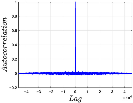 Autocorrelation result for the chaotic sequence generated by system (1) when , after applying the proposed histogram equalization algorithm.