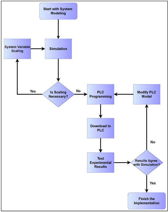 for . The classical fourth-order Runge–Kutta method with a sufficiently small step size was employed in this study to ensure reliability, stability, and preservation of original chaotic dynamics. In future work, we plan to investigate the impact of different numerical integration schemes on the accuracy and stability of chaotic behavior. Such a comparison will help to better assess the numerical reliability of PLC-based realization. Therefore, to design and implement a dynamical system in the PLC, the programming flowchart should be followed, shown in Figure 14.