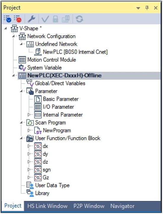 The proposed realization of a chaotic system using a PLC platform was experimentally validated through a structured series of software simulations and hardware-based tests. In this work, the three state variables of the chaotic system were implemented as user-defined function blocks (UDFBs), enabling modular and reusable code within the XG5000 version 4.78 programming environment. As illustrated in Figure 15, these UDFBs encapsulate the system’s nonlinear differential equations, allowing for the precise and scalable execution of the chaotic dynamics on the XEC-DN32H. This modular design not only enables real-time execution of the chaotic system on industrial-grade hardware but also facilitates scalable implementation for more complex dynamical models.