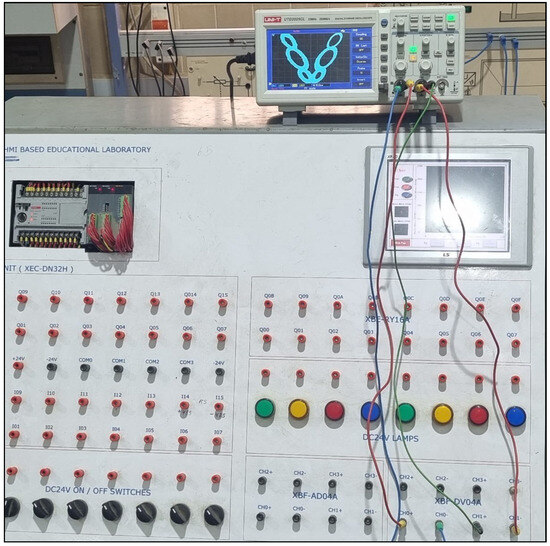 Subsequent experimental validation was conducted using the physical setup shown in Figure 18, where the XEC-DN32H PLC, equipped with the XBF-DV04A analogue output module, was interfaced with a digital oscilloscope. This setup enabled real-time monitoring of the chaotic signals generated by the PLC. When the system parameter was set to and mapping parameters were set as and , the experimental results shown in Figure 19 exhibit a distinct V-shaped self-excited attractor with adjacent parabolic loops, forming a two-scroll chaotic pattern. The attractor’s geometric structure closely matches the simulated phase portrait, indicating a high degree of fidelity between the software simulation and physical system behavior.