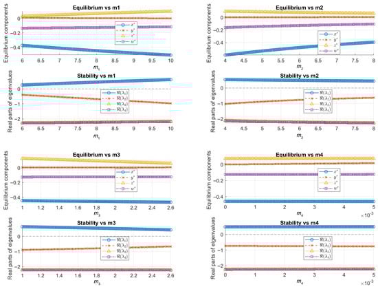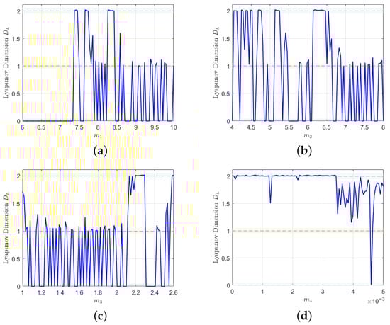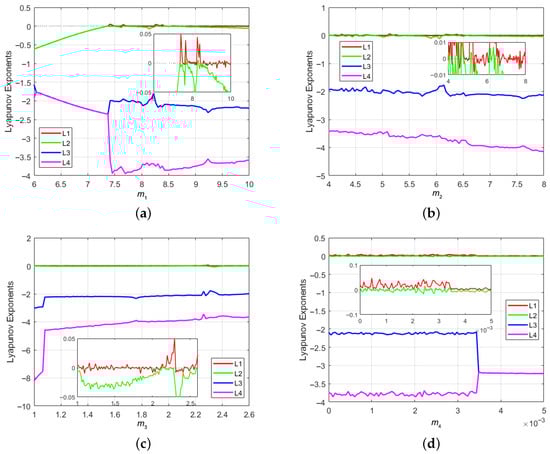 Lyapunov exponents of the system for varying m values: (a) ; (b) ; (c) ; and (d) .