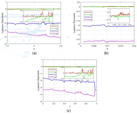 Lyapunov exponents of the system for varying (a) a, (b) b, and (c) c values.