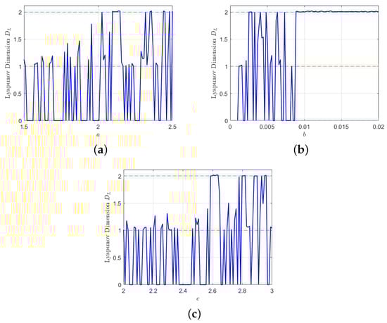 Variation in the Lyapunov (Kaplan–Yorke) dimension as a function of structural parameters: (a) a, (b) b, and (c) c.
