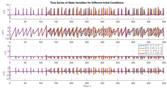 Case 4: Large Initial w (Highly Confident Market). To examine the impact of extremely high market confidence, we simulate the full system (2) with a large initial value . The initial surge in confidence temporarily boosts , , and , but due to the small value, the system eventually returns to bounded oscillations. Economically, this reflects periods such as the peak of the dot-com bubble, where extreme optimism drove rapid market expansion before stabilising forces moderated growth.