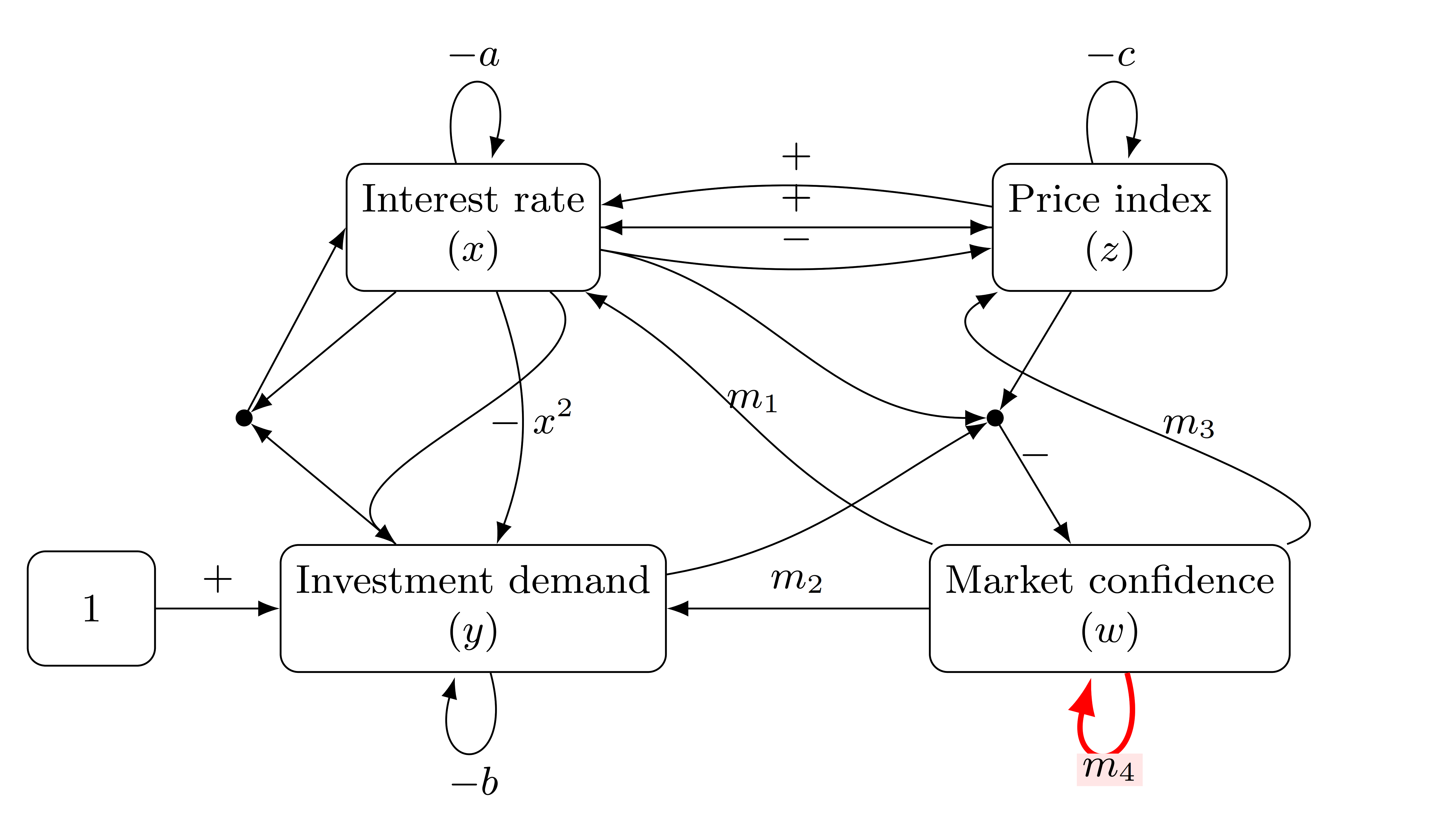 - Nonlinear suppression effect: Following the Xin–Zhang system, confidence growth is damped when interest, investment, and prices are simultaneously high; we retain the multiplicative brake [14].