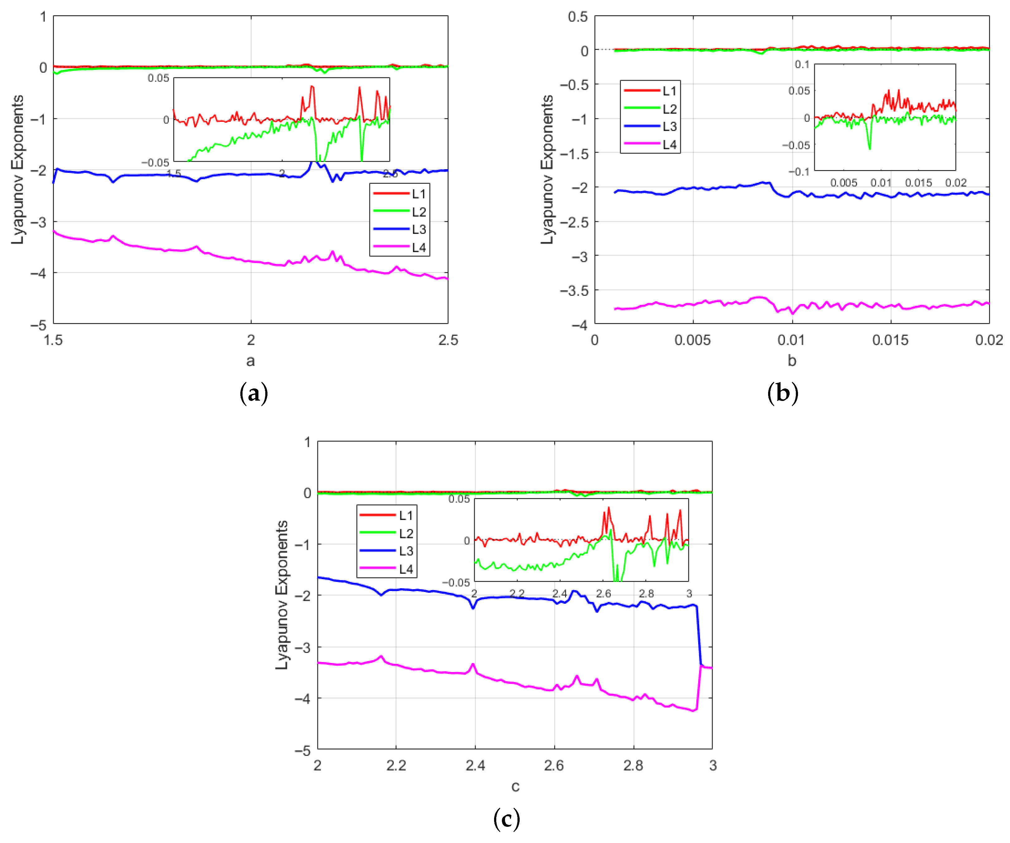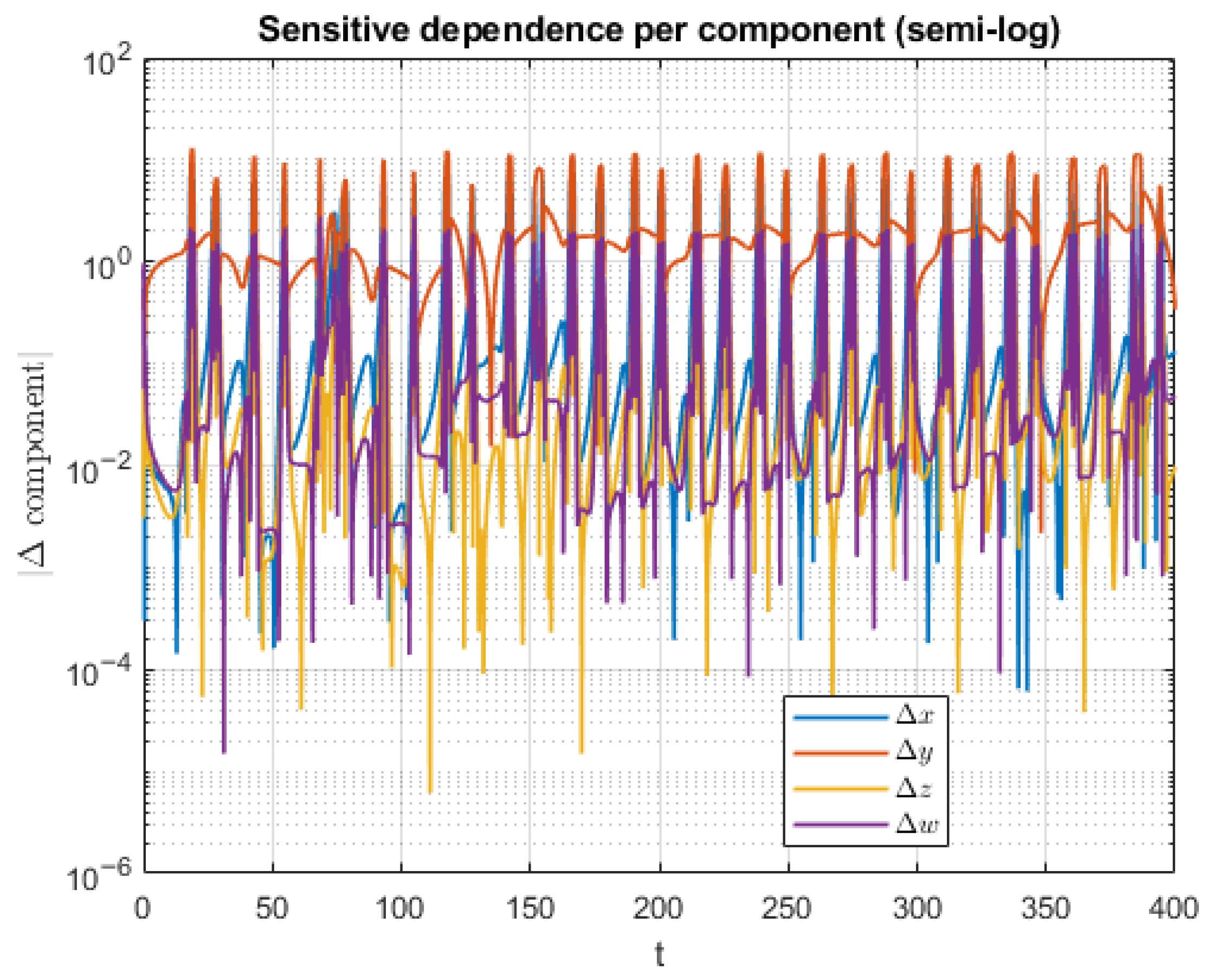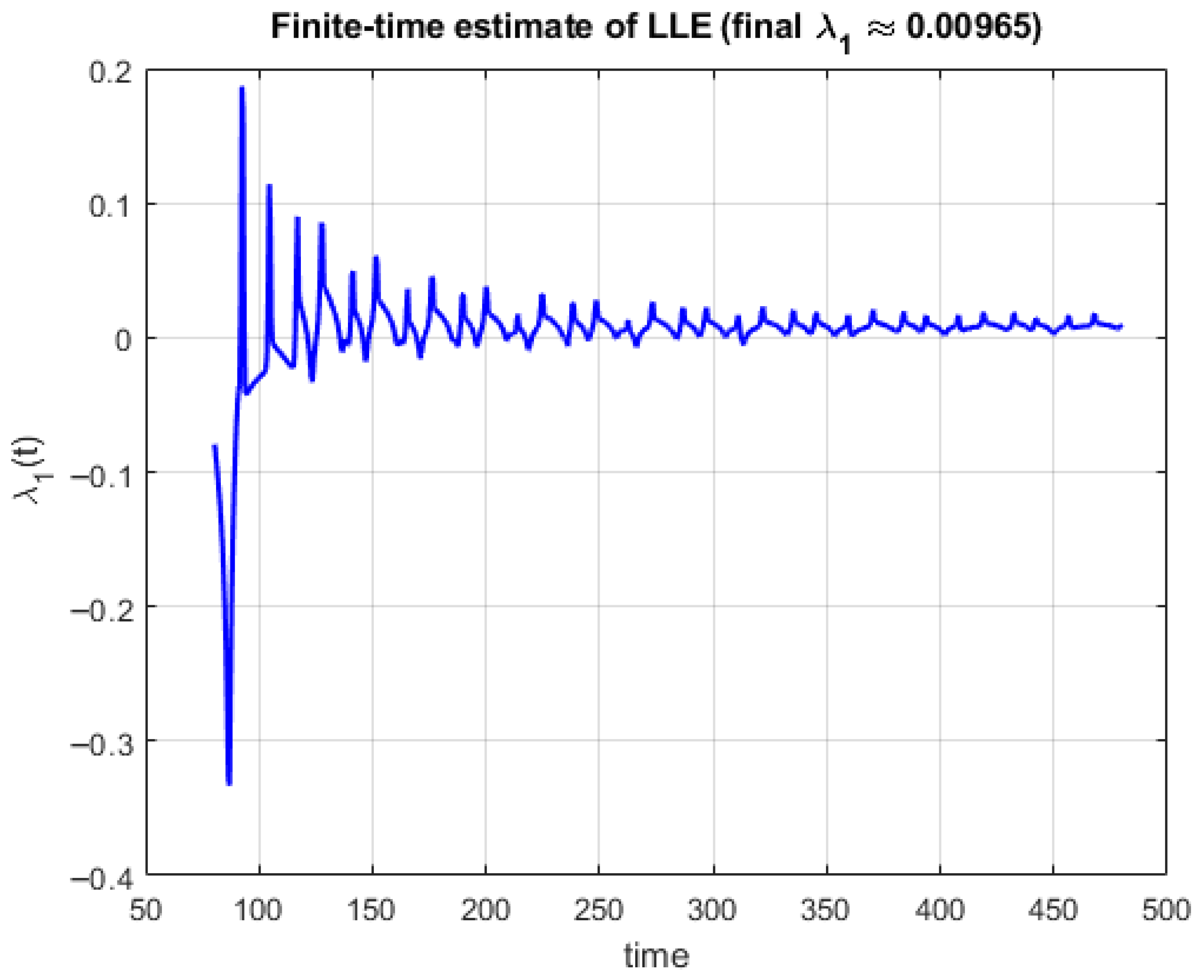 3.1. Chaotic Diagnostics at the Baseline Parameter Set