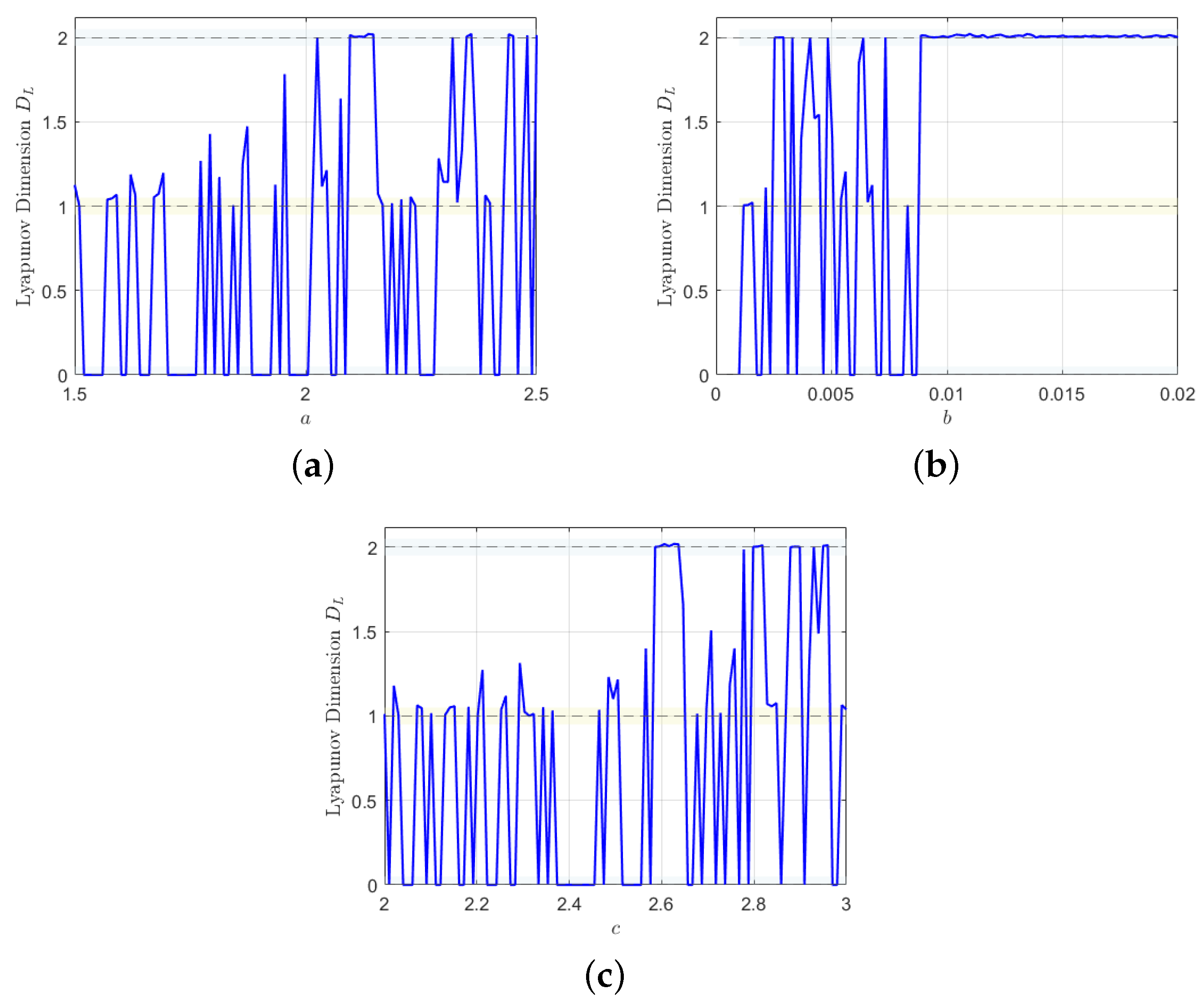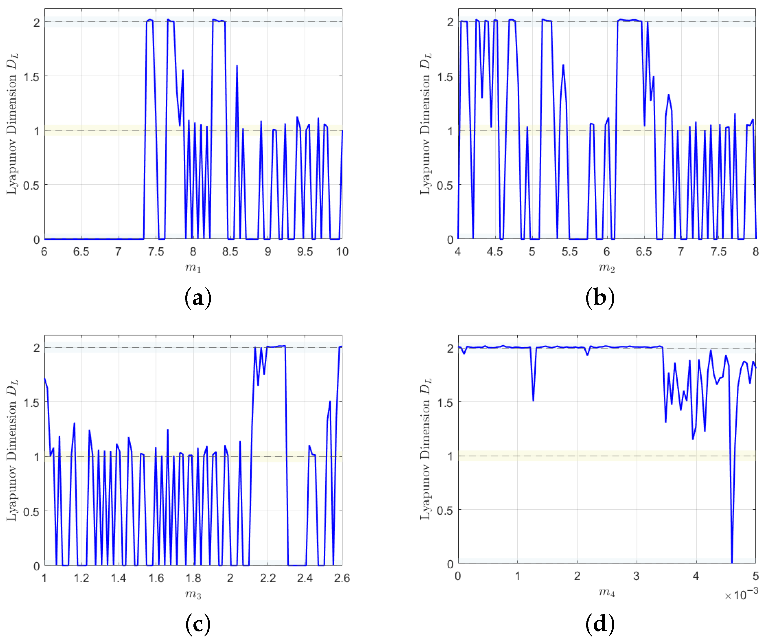 3.2.1. Lyapunov Dimension and Dynamical Transitions