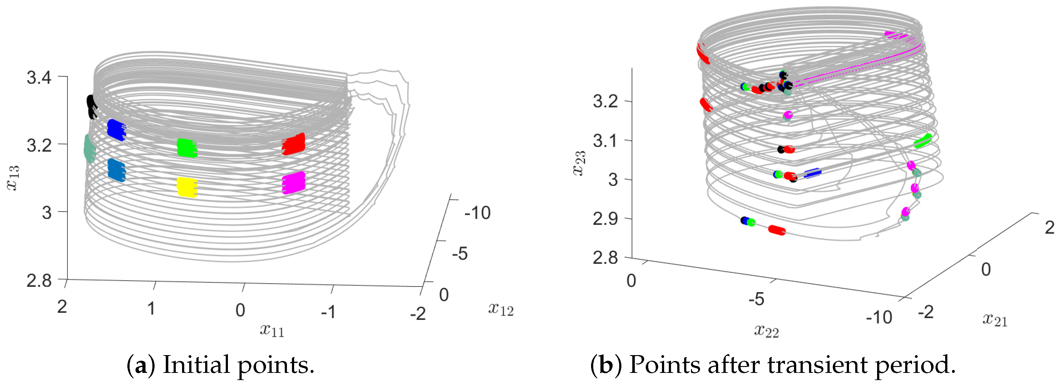As shown in Figure 2, the trajectory moves from x 1 j to x 1 j n if they are contained in a small vicinity ( ρ 1 ). In our illustration, a region of state space is represented with the same color. Then, in the second neuron, our initial points move, after the same amount of time, to places where they are no longer neighbors. Then, there is no static functional relationship between these systems; in other words, there is no GS in our MNN model. Alternatively, in Figure 3, where the coupling memristors have the value β = 1.14 , all neighbors in the second neuron are also in a small vicinity ( δ 1 and d 0 ). Therefore, there is GS between these neurons.