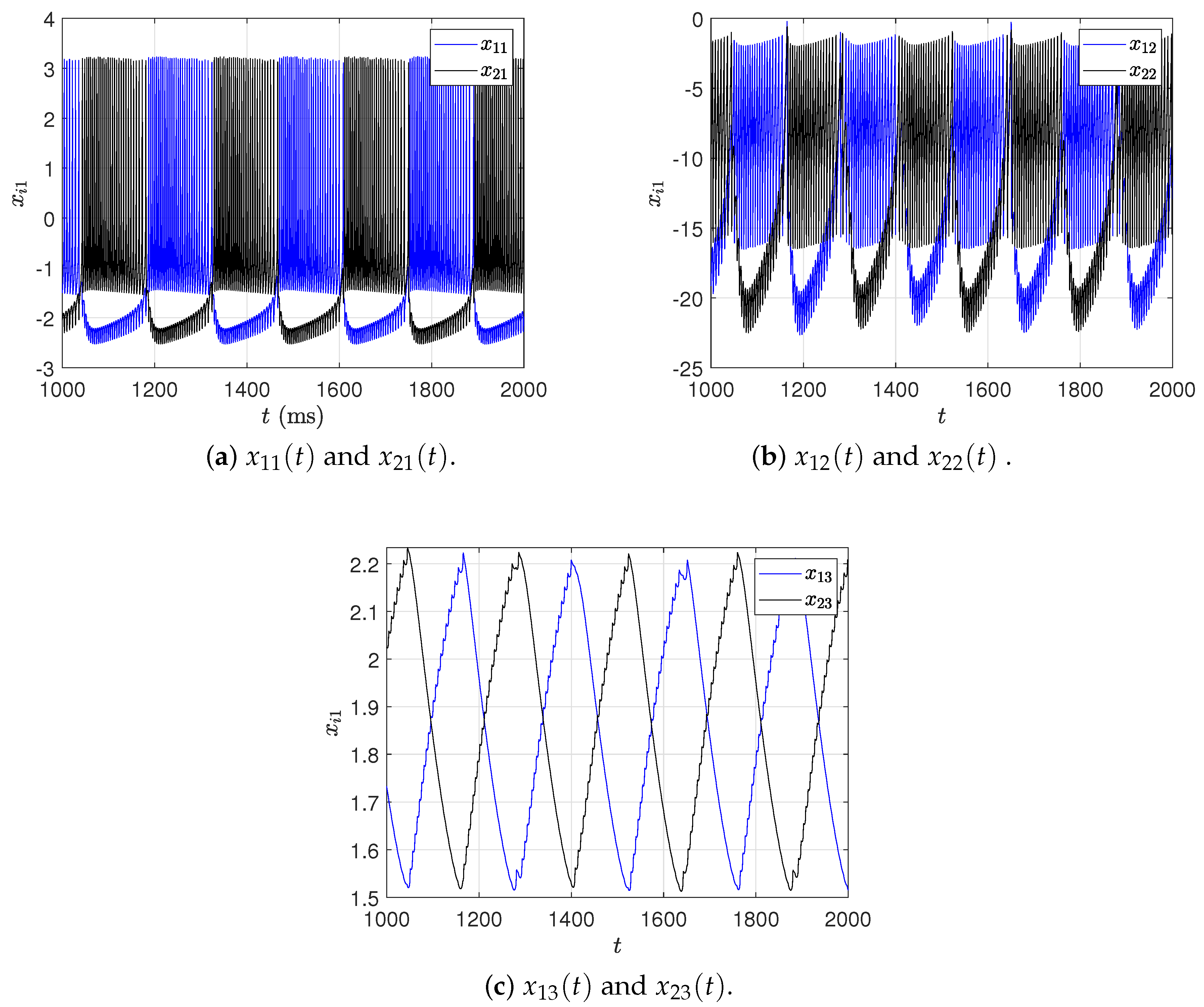 x ˙ 11 ( t ) = x 12 ( t ) x 13 ( t ) a x 11 3 ( t ) + b x 11 2 ( t ) + I e x t ( t ) + M 21 ( t ) x ˙ 12 ( t ) = c x 12 ( t ) d x 11 2 ( t ) x ˙ 13 ( t ) = ε [ σ ( x 11 ( t ) x 0 ) x 13 ( t ) ] x ˙ 21 ( t ) = x 22 ( t ) x 23 ( t ) a x 21 3 ( t ) + b x 21 2 ( t ) + I e x t ( t ) + M 12 ( t ) x ˙ 22 ( t ) = c x 22 ( t ) d x 21 2 ( t ) x ˙ 23 ( t ) = ε [ σ ( x 21 ( t ) x 0 ) x 23 ( t ) ]