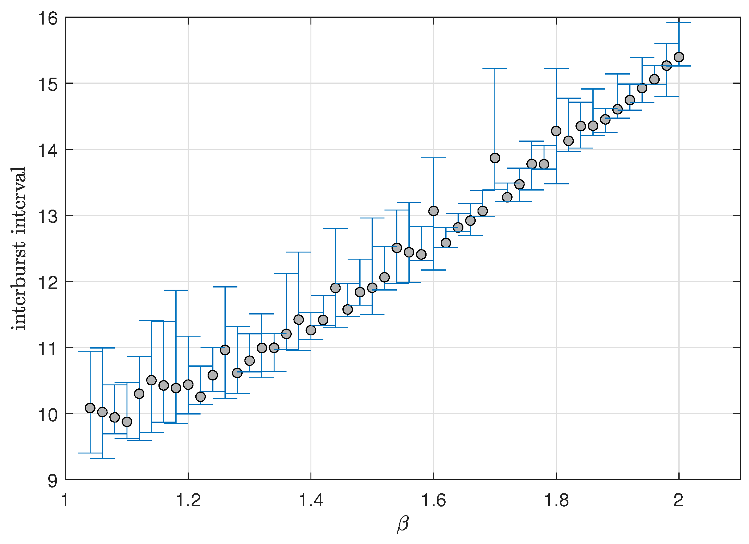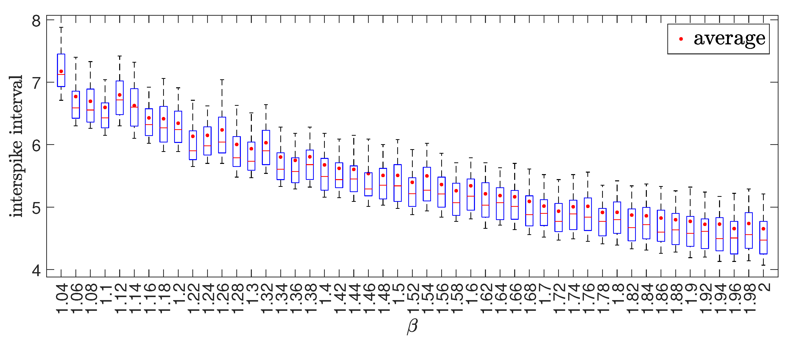 Additionally, we consider the effects of β on the MNN’s IBI and ISI. For each value of β , we register maximum, minimum, and average values. Figure 5 shows that as β increases, the IBI also grows. Conversely, the average ISI decreases linearly as the value of β decreases (see Figure 6).
