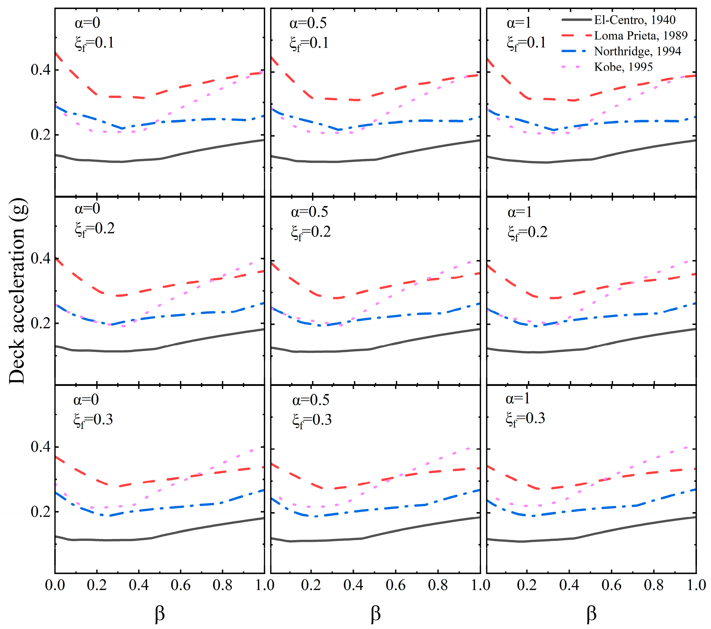 - Deck acceleration decreases with increasing inertance ratio up to an optimum range between 0.2 and 0.5, beyond which further increase results in amplification. The influence of inerter damping and placement factor remains comparatively limited across the examined earthquake records.
