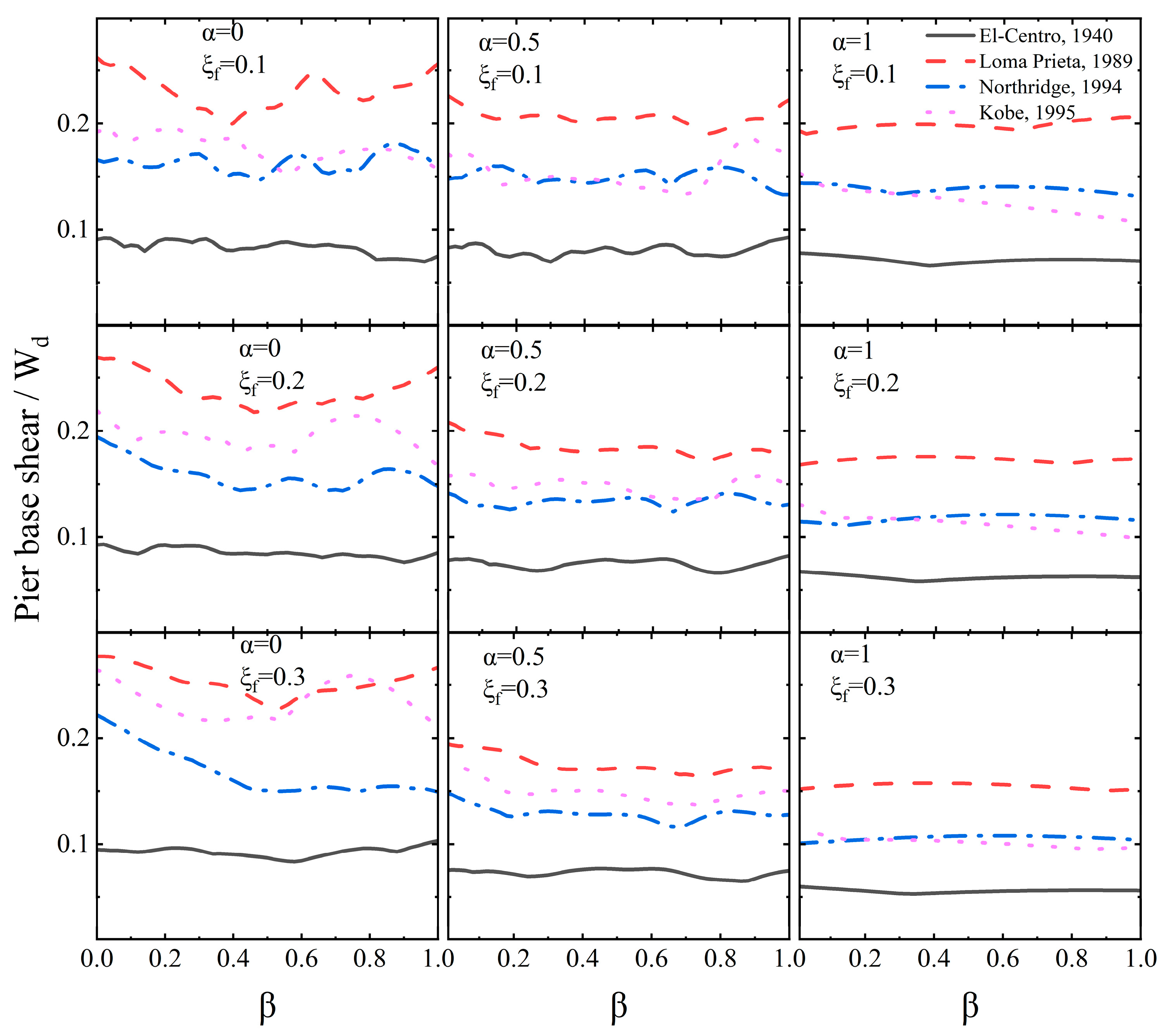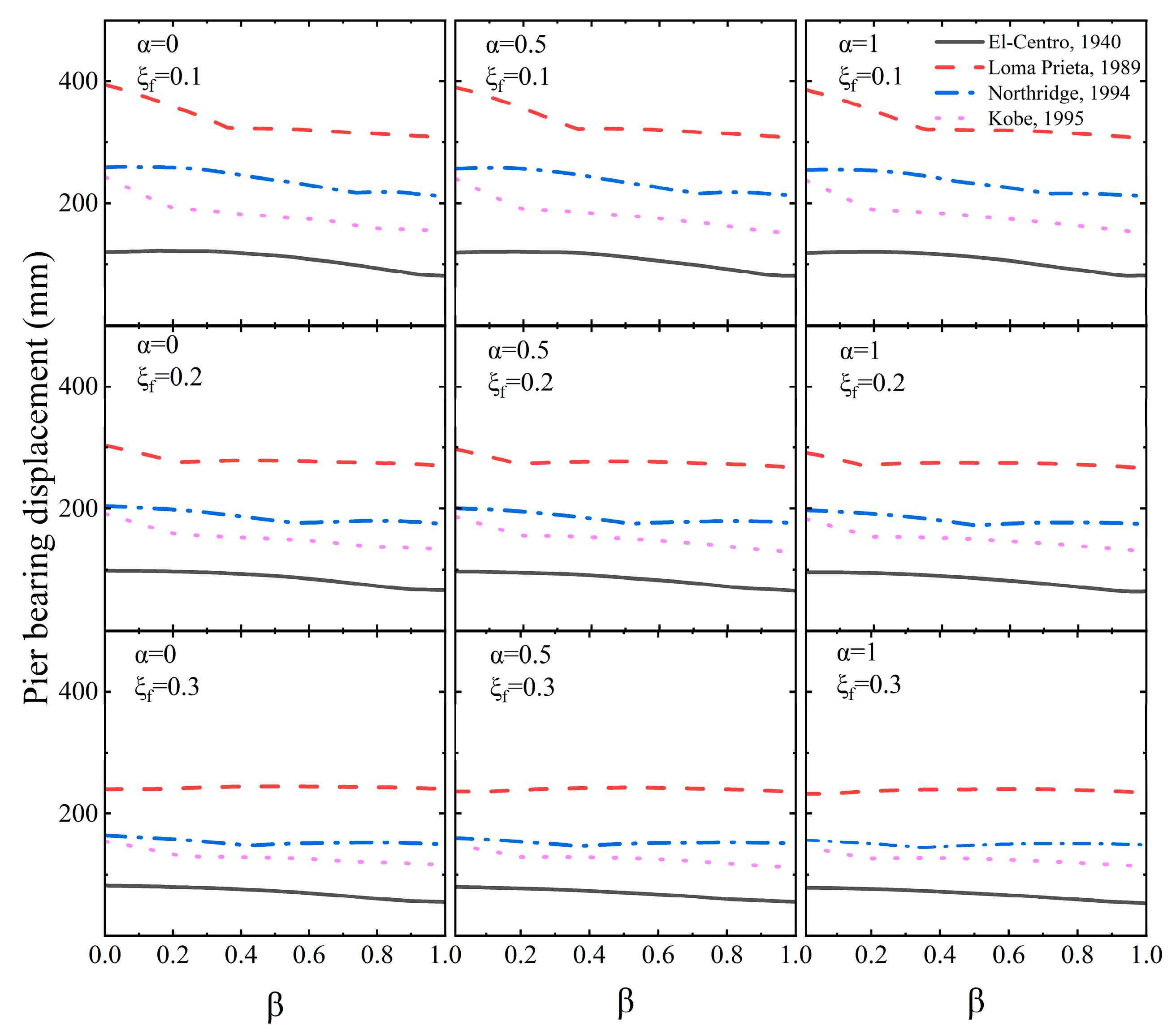 - Pier bearing displacement decreases with increasing inertance and is further reduced at higher inerter damping levels. At larger damping values, the response control becomes predominantly governed by damping effects, while the placement factor exerts negligible influence across the examined earthquake records.