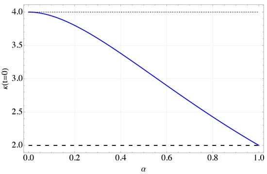 Kurtosis coefficient for Equation (33) as a function of anomalous exponent , (blue solid line). Close to , the kurtosis value is twice that of the non-fractional case (dashed line).