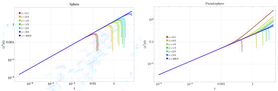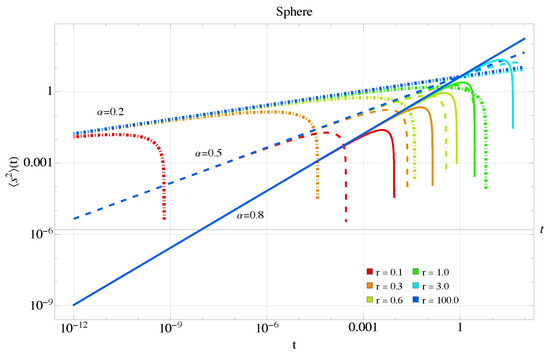 We can obtain the correction to the geodesic mean square displacement as a function of the radius in the case of normal diffusion by means of Equation (9). For these two surfaces, the geodesic mean square displacement is shown in Figure 2. For the sphere with large curvature (small radius), the correction is significant, and the behavior is considerably slower than in the standard case. As the radius increases, the geodesic MSD approaches the linear case, which is recovered at very large radii (negligible curvatures). The opposite occurs for the pseudosphere. For small radii, the curvature is negative and with large magnitude. In this case, the correction term accelerates the diffusive behavior, resembling superdiffusion. This effect decreases as the radius increases.