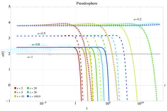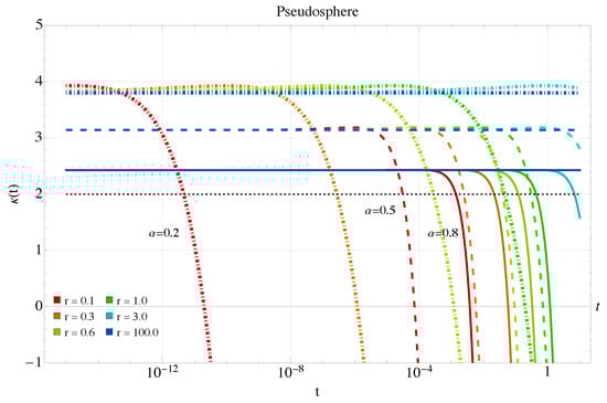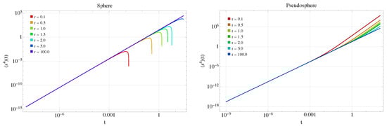 In Equation (19) for kurtosis, the correction is quadratic in both time and curvature. This means that, regardless of the curvature’s sign, the correction for surfaces with the same magnitude of curvature will be identical. Figure 5 illustrates this for both the sphere and the pseudosphere. On a flat surface, the kurtosis is 2, but on the sphere and the pseudosphere, as the radius decreases, the kurtosis decreases rapidly with smaller radii on increasingly shorter time scales. Note that kurtosis cannot be negative, so the approximation is no longer valid in the negative regions shown in Figure 5. This occurs sooner for surfaces with smaller radii.