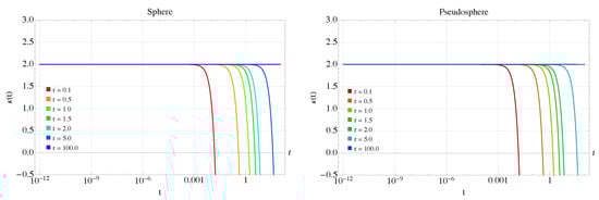 Kurtosis Equation (19) for the sphere (left) and pseudosphere (right) for different radii, non-anomalous case, with .