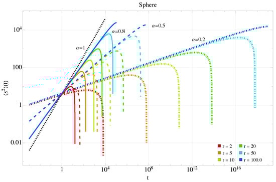 Mean squared displacement Equation (31) for the sphere in the anomalous case with . Colors ranging from red to blue indicate an increase in radius and a decrease in curvature. Solid curves indicate an anomalous exponent of 0.8, dashed curves for 0.5, and dotted curves for 0.2.
