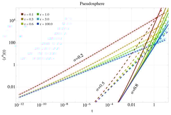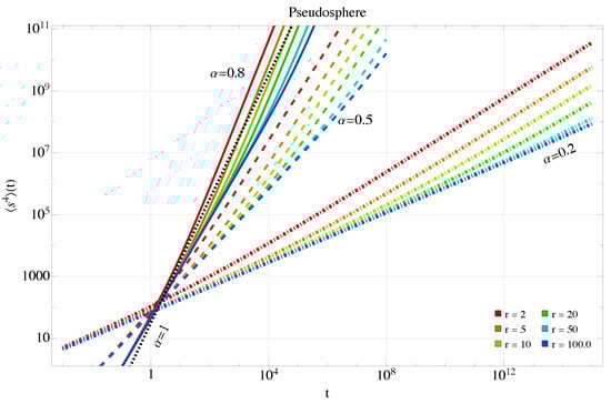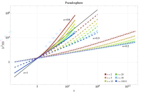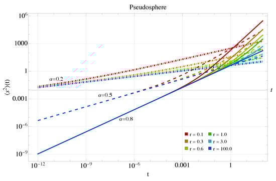 Mean squared displacement Equation (31) for the pseudosphere in the anomalous case. Colors and dashing style as in the previous figure.