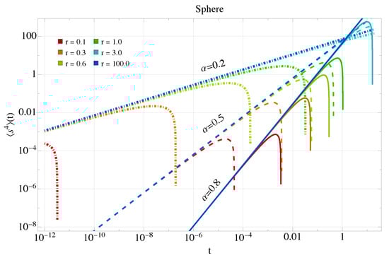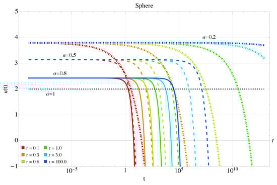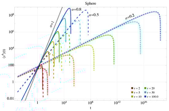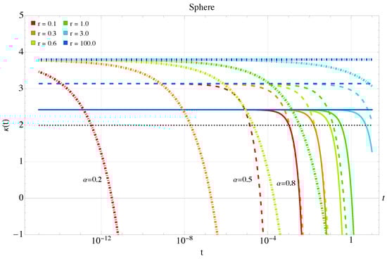 We also note that as time increases, the behavior of the anomalous exponent reverses: it slows the dynamics as becomes smaller, while the curvature continues to decrease it. In this case, it is important to remember that truncating the series is valid as long as the lower-order term dominates the next-order term. In this sense, the series coefficients are relevant time scales. For large radii, —the time required to explore the entire sphere through anomalous diffusion— can be theoretically very large for small , e.g., for a radius of 10 and , . These cases are described in Figure 7, and we plot long times to appreciate the effect. Notably, the subdiffusion effect is preserved in this case.