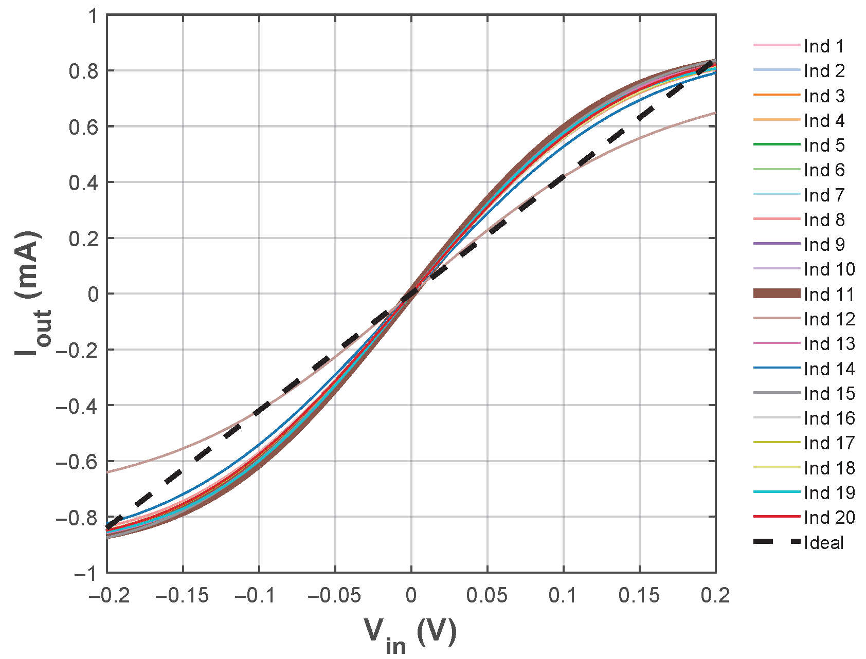 V curve with that of a physical CMOS OTA, revealing deviations induced by nonlinearities.