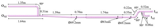 Schematic illustration of Connection A: two pipes merge into a single pipe (with an inner diameter that varies from 69.2 mm to 83.0 mm), which then branches into two pipelines, one of which continues along the main pipeline route (i.e., OA2 outlet).