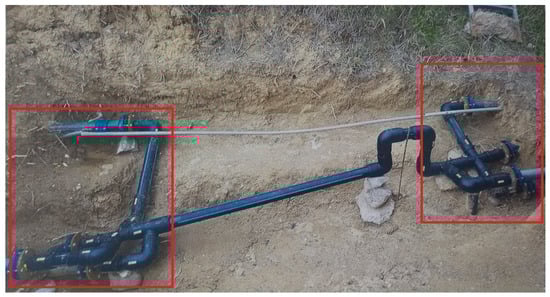 On-site photograph of Connection A: two HDPE pipes merge into a single pipe (with a diameter that varies from 69.2 mm to 83.0 mm), which then branches into two pipelines, one of which continues along the main pipeline route (right pipe in the photograph).