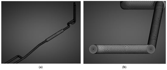 After creating the CAD geometry for each connection, a volumetric mesh was generated for CFD analysis. ANSYS Meshing tools were used to discretize the fluid volume within the pipes. A hybrid meshing approach was adopted: most of each linear pipe segment was meshed by hexahedral elements, swept along the pipeline axis, while the complex junction area was filled by unstructured tetrahedral elements. The junction, where pipes come together, has a complex geometry, which benefits from the flexibility of the tetrahedral meshing. To improve the accuracy of the computational mesh, close to the pipe wall surfaces, a prism layer (inflation) mesh was adopted for all surfaces. The goal was to have at least 5–10 quad-dominant layers (see Figure 5b and Figure 6b) and a smooth growth rate to properly resolve the flow near the wall and evaluate the wall shear stresses. The size of the initial (from the wall boundary) prism layer was set so the dimensionless distance to the wall y+ of the near-wall cell elements would be within the 30–100 interval and thus fall into the region of the logarithmic law applicable by means of standard wall functions [27,34]. This approach complies with the recommended wall treatment guidelines for the standard k-ε two-equation turbulence model of ANSYS Fluent software [32]. Mesh refinement was applied with caution: the branch inlet and junction chamber zones, the regions where flow separation and the highest velocity gradients are expected, were tuned to have a reduced largest cell size relative to the farther downstream and upstream pipe sections.