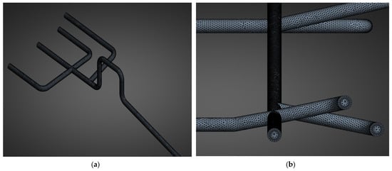 For Connection A (Figure 5a,b), a mesh independence study was conducted to confirm the accuracy of the numerical solution. Specifically, based on the numerical results, the flow distribution rate and pressure loss demonstrated independence from the mesh resolution for all different mesh resolutions examined. Three independent levels of mesh refinement were tested: a coarse mesh of about 350,000 cells, a medium mesh of about 550,000 cells, and a fine mesh of approximately 725,000 cells. The medium mesh included cells of about a maximum of 6 cm size throughout the pipes and as low as 1 cm throughout the core of the junction. Important numerical results, including the velocity profiles, differed by as little as 3.0% between the medium and the fine mesh, indicating numerical robustness (see also Section 4.1). Therefore, the medium mesh resolution was deemed sufficient to yield accurate results and was applied as the reference baseline for all subsequent simulation results.