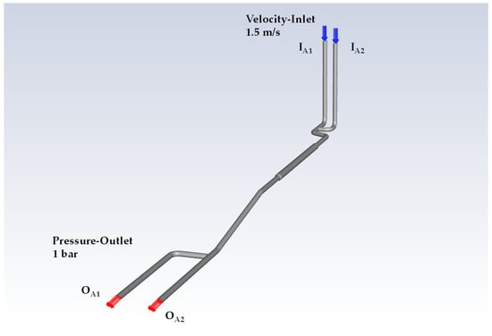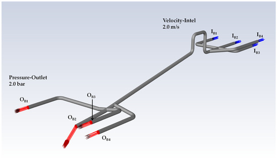 More precisely, for Connection A, all outlet boundaries share the same static pressure of 10 m (approximately 1 bar; see Figure 7), while for Connection B, a similar outlet pressure of 20 m (approximately 2 bar; see Figure 8) was considered. An important note to be made here is that equal outlet pressures allow for the flow distribution to branches to be defined based solely on hydraulic resistance, thus mimicking the case where downstream flow is constrained entirely by the upstream pressure or, equivalently, the consumers’ demand may or may not be met depending on the distribution of the inflow to the outlets.