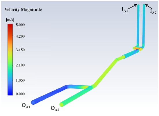 The maximum velocity computed in the system of Connection A was about 4.93 m/s following the initial two-to-one pipes combination (i.e., Inlets IA1 and IA2 inter-connection), albeit restricted to a slender jet that adhered to one side of the pipe.