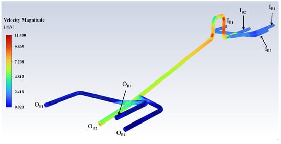 The flow distribution at Connection B (a T-junction followed by a cross-junction on a 90.0 mm line) was qualitatively the same, since the total velocity inlet rates were set to 2.0 m/s for each of the four inlets (see Figure 8). Based on the numerical simulations, it is shown that approximately 84.12% (i.e., velocity magnitude of 6.73 m/s) of the flow proceeds along the 90.0 mm main after the initial T-junction (towards outlet OB2; see Figure 10). Outlet OB4 captures about 8.00% (i.e., velocity magnitude of 0.64 m/s) of the water flow, while Outlets OB1 and OB3 receive approximately 3.13% (i.e., velocity magnitude of 0.25 m/s) and 4.75% (i.e., velocity magnitude of 0.38 m/s) of the total water inflow, respectively.