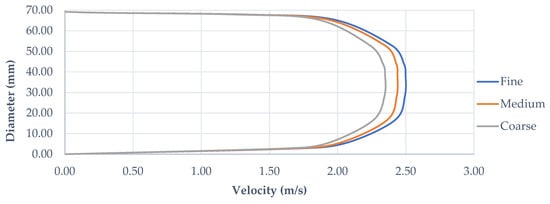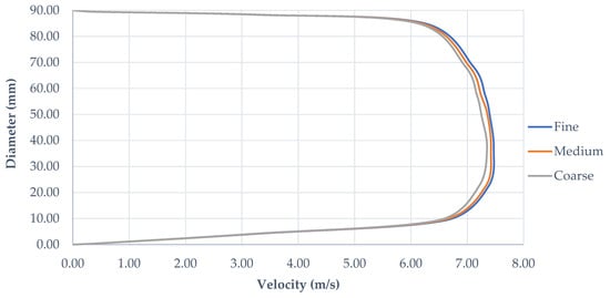 Velocity magnitude profiles at Outlet OA2 obtained using three different mesh resolutions (i.e., Coarse, Medium, and Fine; see Section 3.1).