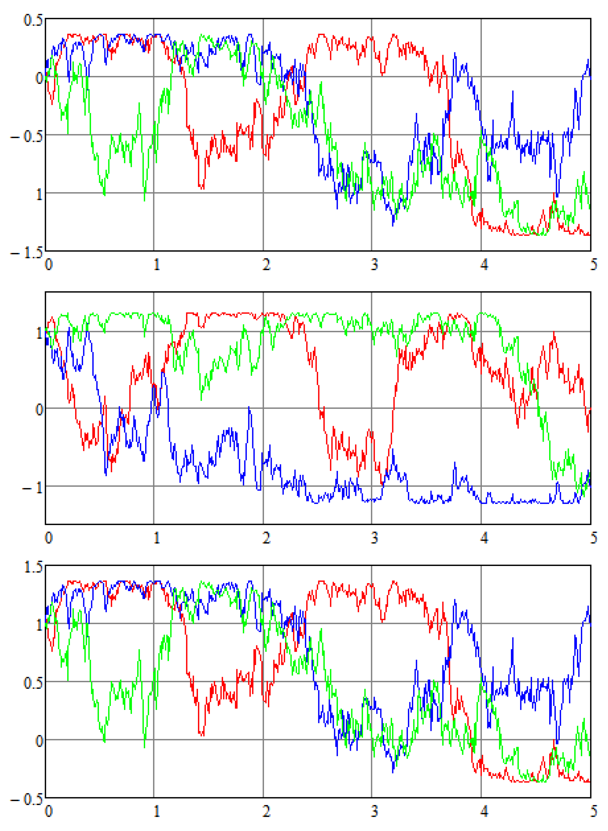 Figure 4 shows three sample trajectories of the solution (the discrete approximation: Y k = X ( t k ) = exp S W ( t k ) x 0 ; graphs are ordered according to state components). Figure 5 contains three sample phase trajectories of the solution, where we use axes for x 1 (left) and x 2 (right) in the horizontal plane, and the vertical axis corresponds x 3 . The trajectories are obtained with the initial conditions x 10 = 0 and x 20 = x 30 = 1 .