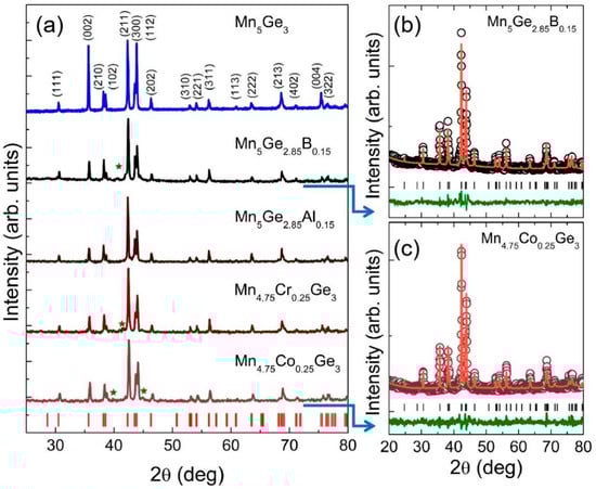 (a) XRD data obtained at room temperature for all of the studied (Mn1−xMex)5(Ge1−yOey)3 alloys. Vertical ticks at the bottom indicate the Bragg maxima positions for Mn5Ge3 labeled with the Miller indices at the top. Stars mark the peaks due to the impurity phases. Panels (b,c) show examples of Rietveld refinement for the selected Mn5Ge2.85B0.15 and Mn4.75Co0.25Ge3 alloys, respectively. The solid line through the experimental points represents a fitted model. The difference between the experimental and theoretical curves is represented by the bottom solid green curve.