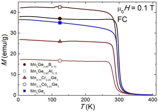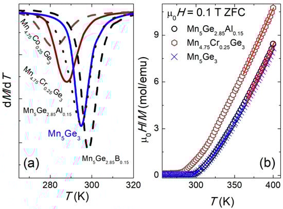 The temperature dependencies of the magnetic susceptibilities of these compounds in the ZFC mode and in the field of 0.1 T are shown in Figure 2. The magnetic transition temperatures (TC) for each alloy were determined from the derivative of the ZFC magnetization (Figure 3a) and are given in Table 2. The TC values for all tested alloys were smaller than for the parent compound (TC = 295(1) K), except for the sample containing B, for which a 3 K increase in TC was observed. The largest reduction in TC was seen for the samples with Co (281(1) K) and Cr (288(1) (K)). The TC values are in good agreement with those presented in the literature (see Table 5). In addition, for the sample (Mn0.95Co0.05)5Ge3, the obtained TC value was higher than that obtained by Kim et al. (TC = 273 K) [] and by Kang et al. (TC = 266 K) []. These results suggest that the magnetic properties of Mn5Ge3 are sensitive to the synthesis conditions.