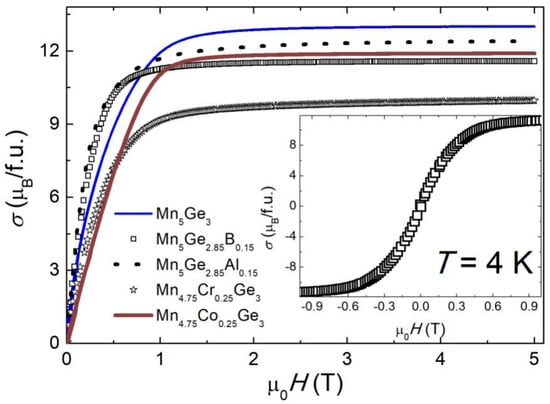 Figure 4 shows the field dependence of the magnetization σ(μ0H) measured at T = 4 K. The values of the characteristic parameters for the starting compound Mn5Ge3, such as saturation magnetization (σS = 2.60(8) μB/Mn), saturation field (μ0HS = 1.5(1) T), and coercivity field (μ0HC~10 mT), are in good agreement with literature values []. The value of σS decreased as a result of all the chemical composition changes made (see Table 2), consistent with results reported earlier [,,,]. On the other hand, a small amount of B or Al in the place of Ge reduced μ0HS to 1.2(1) T, making these samples easier to magnetize. From the inset of Figure 4, it is evident that after the chemical modification no hysteresis loop appeared in the samples studied.