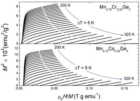 Figure 5 shows the Arrott plots [] for the alloys with Co and Cr as examples. The positive slopes of the Arrott plots indicate that the paramagnetic (PM) to ferromagnetic (FM) transitions were of the second order.