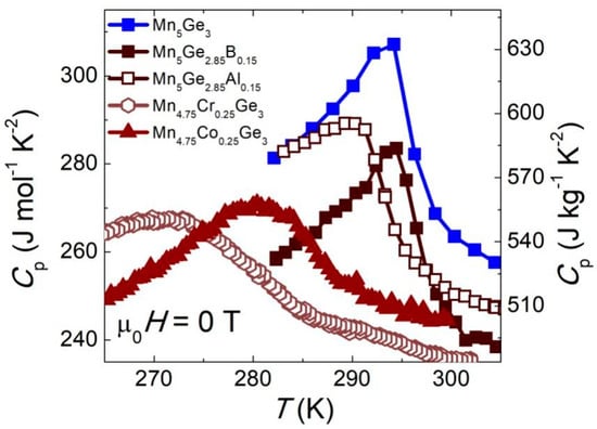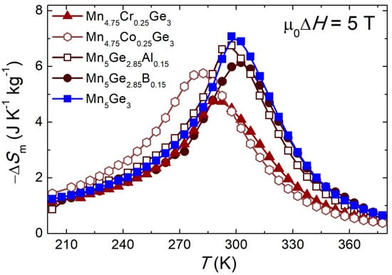 Additionally, the specific heat (Cp) data (Figure 9) were used to calculate the adiabatic temperature change ∆Tad = −∆Sm × T/Cp []. For this purpose, the maximum value of −∆Sm and the Cp value at TC were used. The obtained values of the magnetocaloric parameters are summarized in Table 3. For all samples, the ∆Tad value fluctuated around 1 K for μ0∆H = 1 T. For the samples with Al and B, the ∆Tad value was slightly higher (by ~0.1 K) than for pure Mn5Ge3, but the difference was within the estimated measurement error. For the samples containing Cr and Co, the values of ∆Tad were clearly lower but in line with previous results of direct measurements by Kang et al. []. Thus, for all of the abovementioned chemical modifications, the decrease in the ∆Tad value was due to the blurring of the magnetic transition and lower magnetic entropy.
